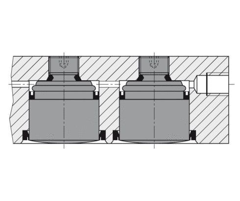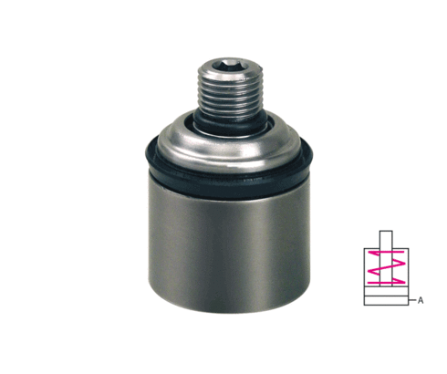 Plungerkolben einfachwirkend mit integrierter Rückstellfeder, Hubbegrenzung und Befestigungsschraube als nicht demontierbare Einheit.