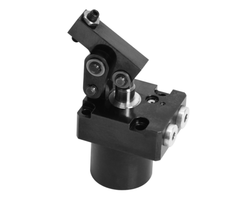 Der Hebelspanner ist ein doppelt wirkender Hydraulikzylinder mit integriertem Spannhebel. Bei Druckbeaufschlagung fährt der Kolben aus und schwenkt den Spannhebel über die Schwinge nach vorn und gleichzeitig nach unten auf das Werkstück. Die Kolbenkraft wird dabei um 180° umgelenkt und steht, abhängig von der Hebellänge, als Spannkraft zur Verfügung.
