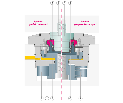 Ein Kolben wird mit Federn in der Spannposition gehalten. Der Spannmechanismus ist kraftarm in der X und Y Achse verschiebbar.
