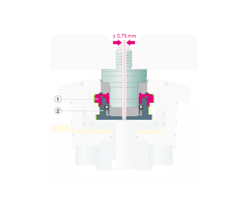 - Dabei kann der Spannmechanismus (1) & (2) Positionsabweichungen von Einzugsnippel zu Element kraftarm ausgleichen. Beim Ausgleichselement in einer Achse und beim Element ohne Zentrierung in X und Y Achse (± 0,75 mm).