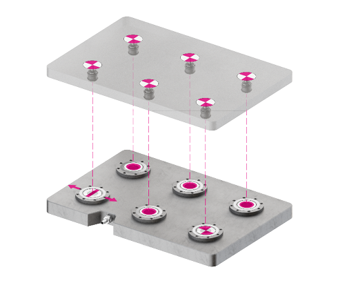 Durch den großen Ausgleich genügt es, die Position der Elemente und Einzugsnippel mit großzügigen Toleranzen zu fertigen. Das Gesamtsystem ist immer nullpunktgenau.