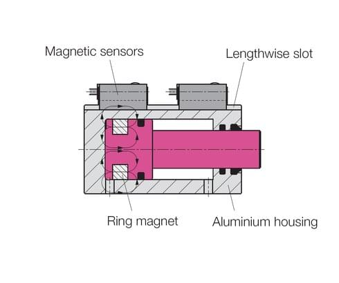 This must be taken into account when adjusting the magnetic sensors. When the piston is stationary, the magnetic sensor should always be pushed towards the piston from the opposite direction of movement.