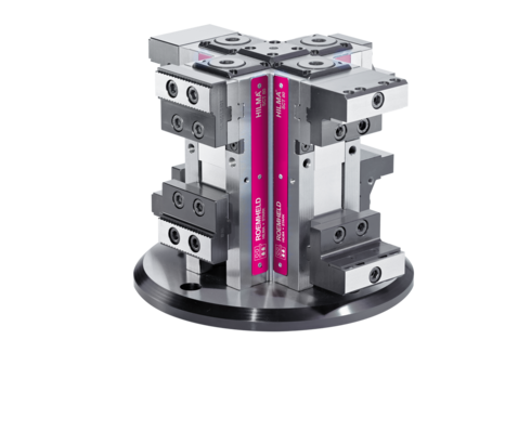 Tower workholding systems of the HILMA.SCT series excel by a very compact design. Thanks to the adjusting spindle arranged in the upper part of the housing, deformation in the base during clamping is reduced.