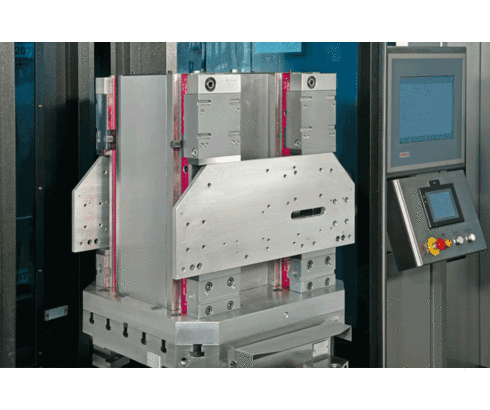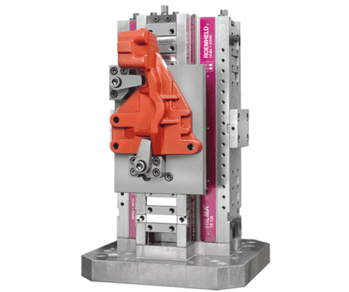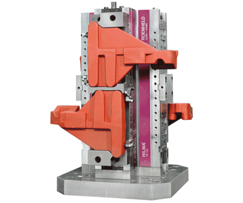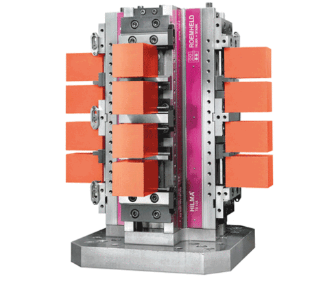 Mechanically-operated square clamping tower "HILMA.TS 125" for use in series production with floating central jaw for 16 workpieces. The machine runtime is considerably increased. The tower clamping system is also suitable for clamping of complex workpiece contours and the simultaneous machining of components with identical and different dimensions in horizontal machining centres. The patented guide and sealing system guarantees maximum process safety, even for complex machining tasks. The aluminium base plate can be adapted to a wide variety of machine pallets.
