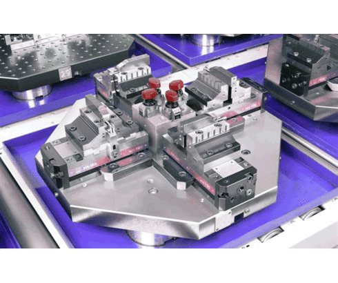 The use of four hydraulic clamping system HILMA.SCS H 120 arranged star-shaped on a change pallet for machining on a 5-axis machine. The shown system uses special jaws with hard-metal coating, Clamping and unclamping are made by a valve with turning knob, alternatively, operation can be effected by foot switch or by the machine control. The hydraulic system is supplied with pressure oil through deep-hole drilled channels in the base plate.