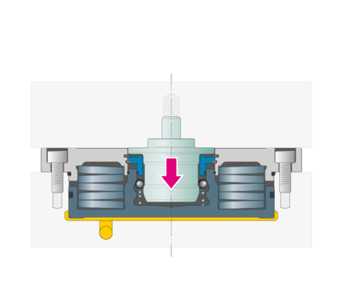 - The piston (2) is subjected to the pressure (1) and moves upwards. The spring assembly (3) is compressed.