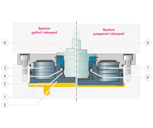 STARK.classic.NG clamping elements are clamped with spring force and released hydraulically or pneumatically. Both hydraulic-releasing and pneumatic-releasing clamping elements are designed with zero point. A third-hand function is possible with hydraulic-releasing clamping elements. STARK.classic.NG clamping elements are also available with indexing and/or coolant outlet.