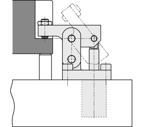 En alimentant en pression, le piston se déplace vers le haut et pivote le levier de serrage par des articulations vers l'avant et en même temps vers le bas sur la pièce à usiner. La force du piston est renversée de 180° et est presque complètement disponible comme force de serrage.